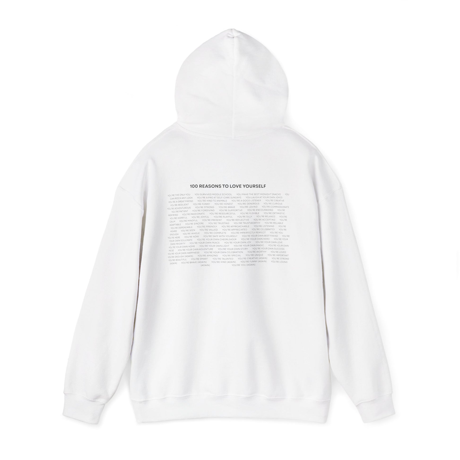 Embrace your journey of self-love and mental wellness with this powerful affirmation hoodie featuring your choice of inspiring back print: 100 Reasons to Love Yourself