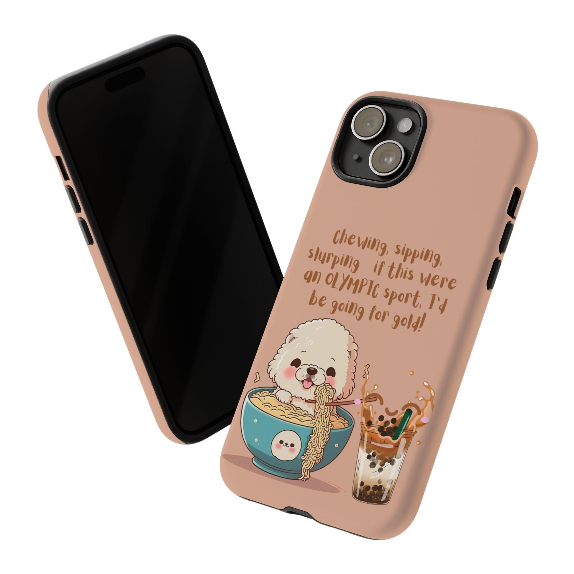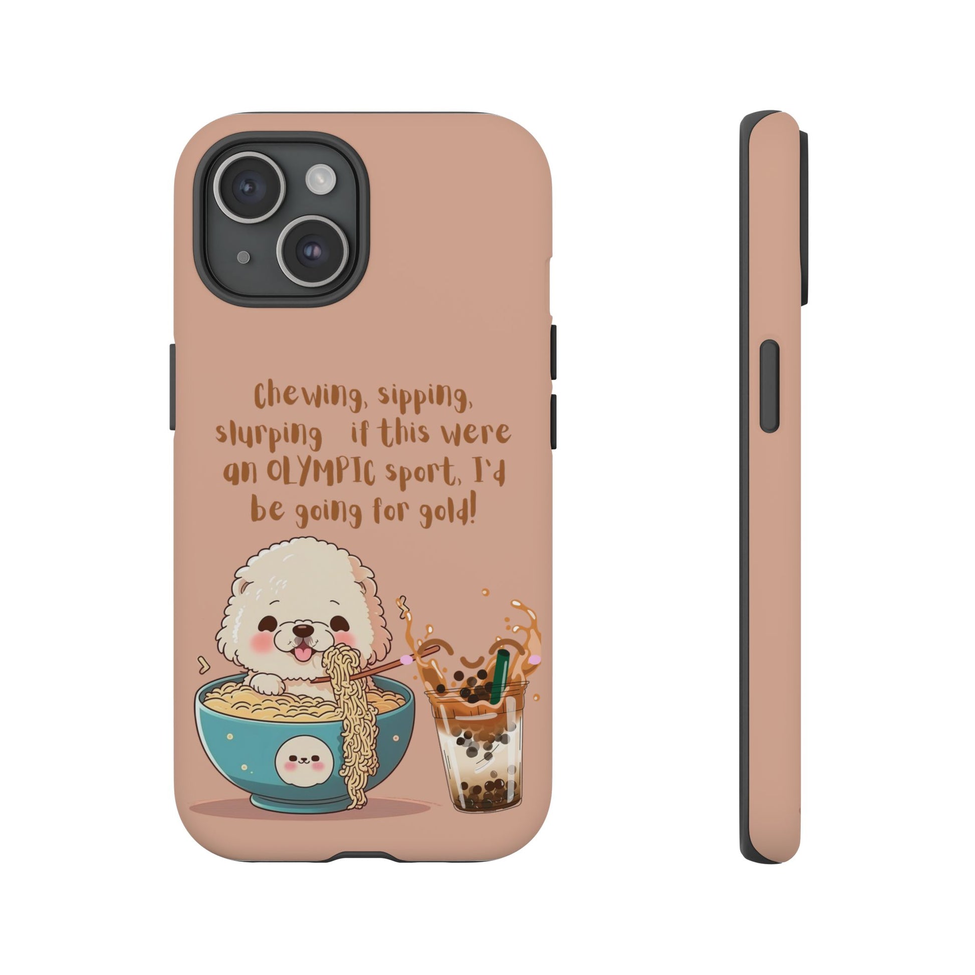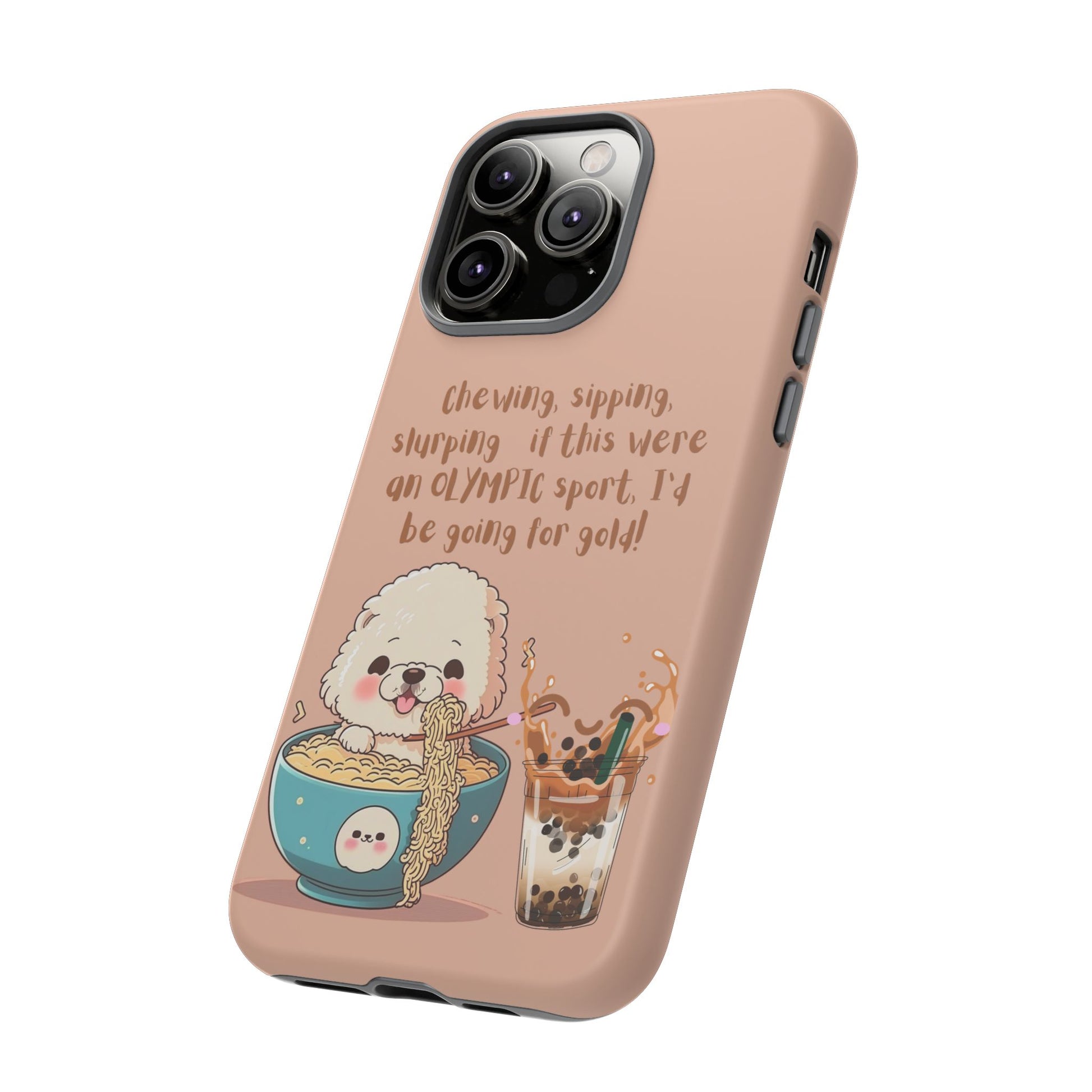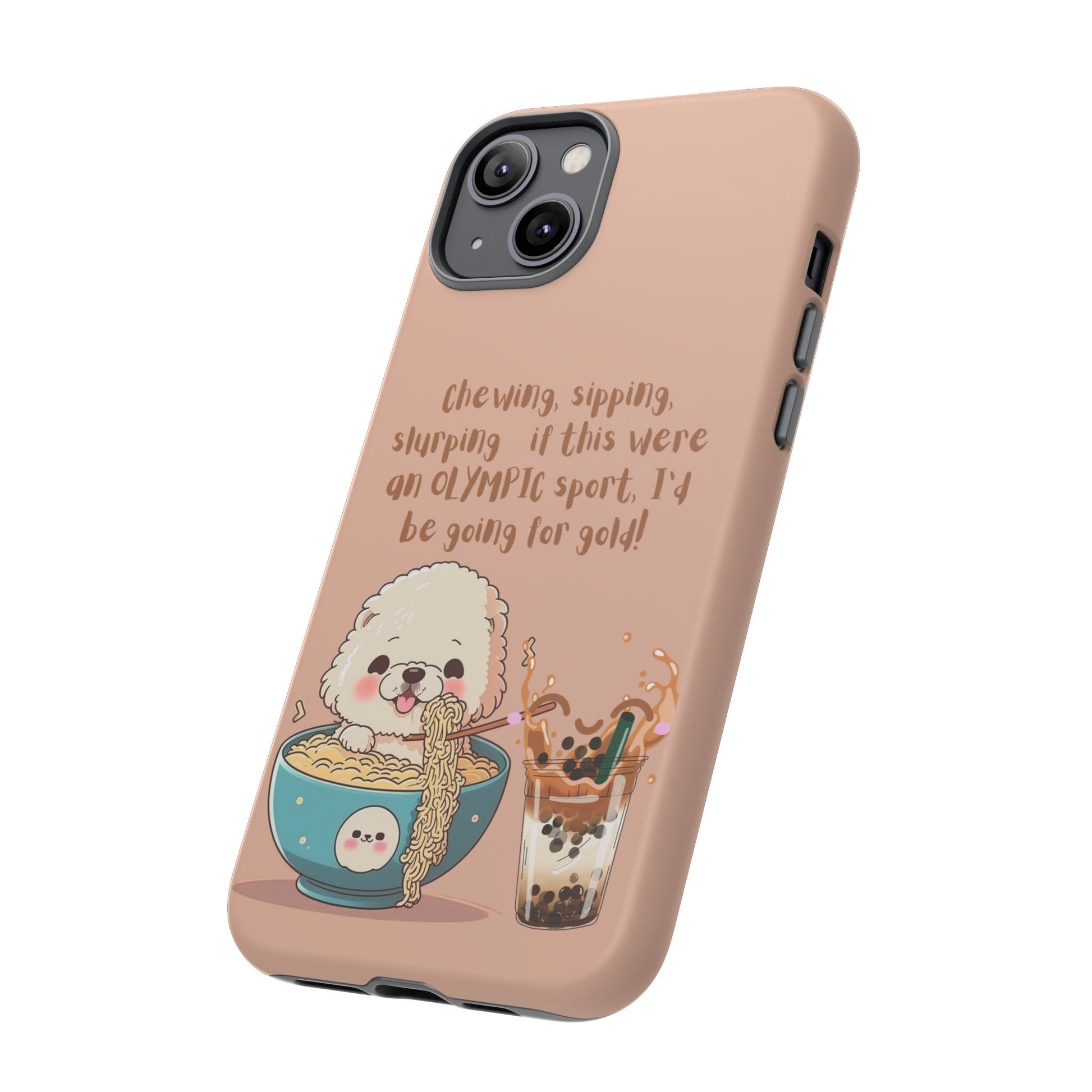 Bring fun and food together with this Dog Eating Ramen iPhone Tough Case! Featuring an adorable dog enjoying ramen next to a bubble tea, this playful design is perfect for foodies and dog lovers alike. The case includes the caption: "Chewing, sipping, slurping—if this were an Olympic sport, I’d be going for gold!" This dual-layer case provides superior protection while keeping your iPhone looking quirky and cute. Available in both matte or glossy finishes for added personalization!
