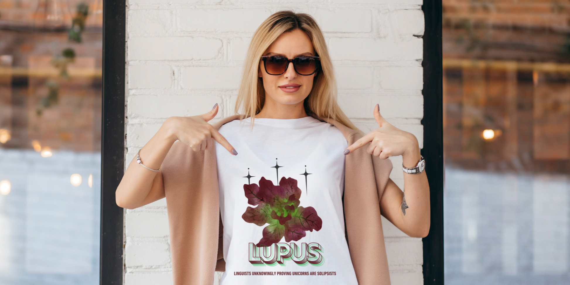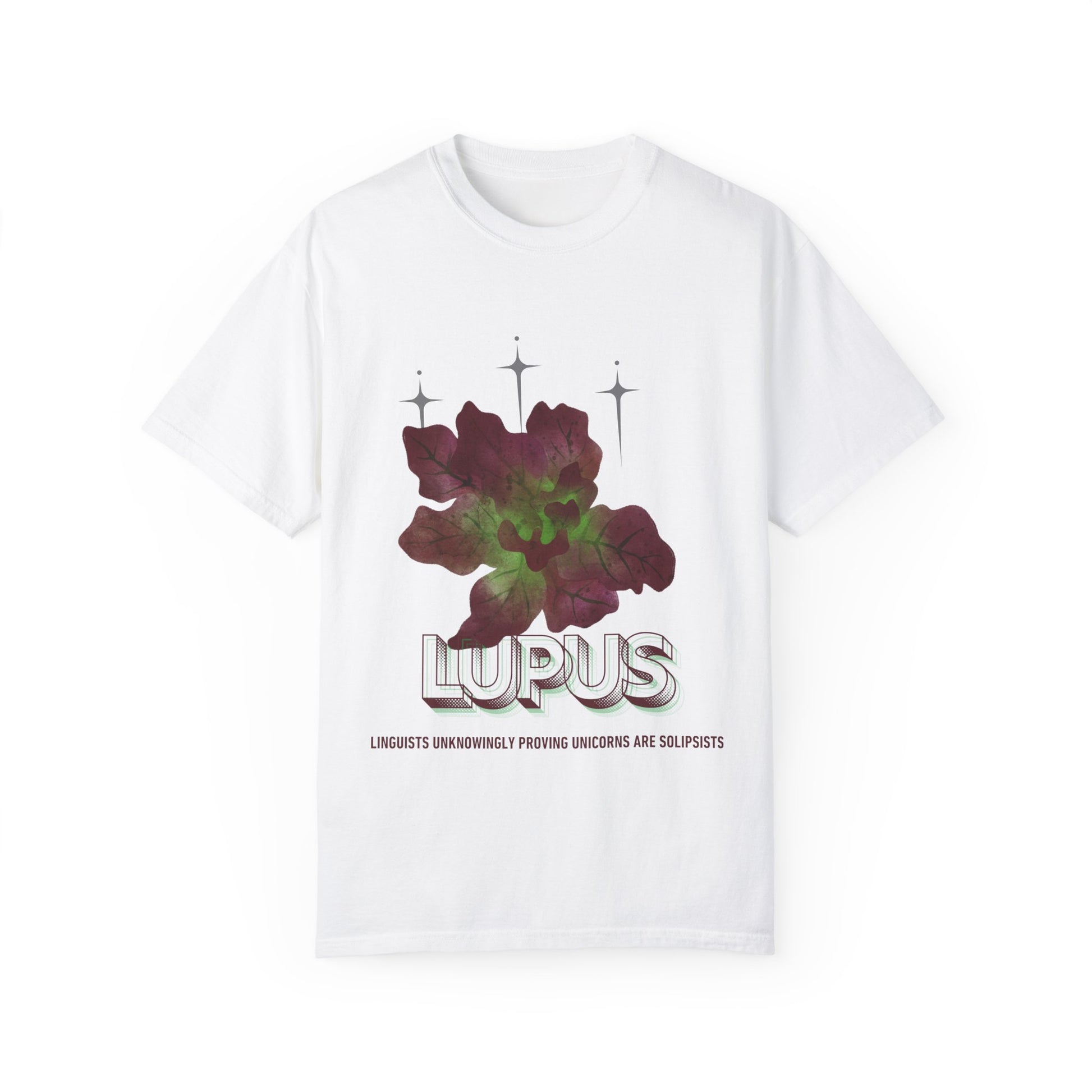 Make a statement with the LUPUS T-Shirt, featuring the clever and eye-catching phrase: "Linguists Unknowingly Proving Unicorns are Solipsists." This unique design combines humor, intellect, and a touch of whimsy, making it the perfect conversation starter for linguists, unicorn enthusiasts, or anyone who loves a good play on words.