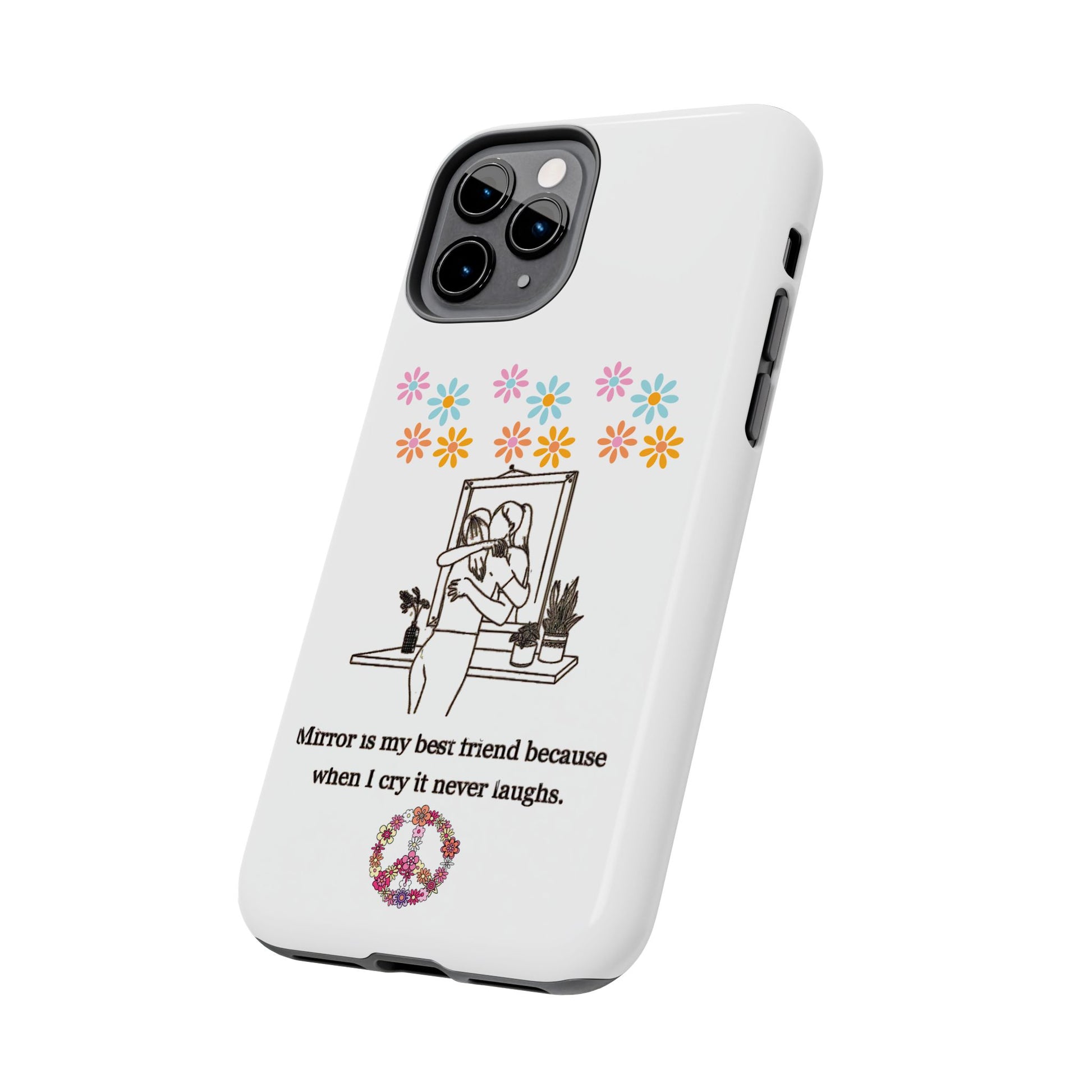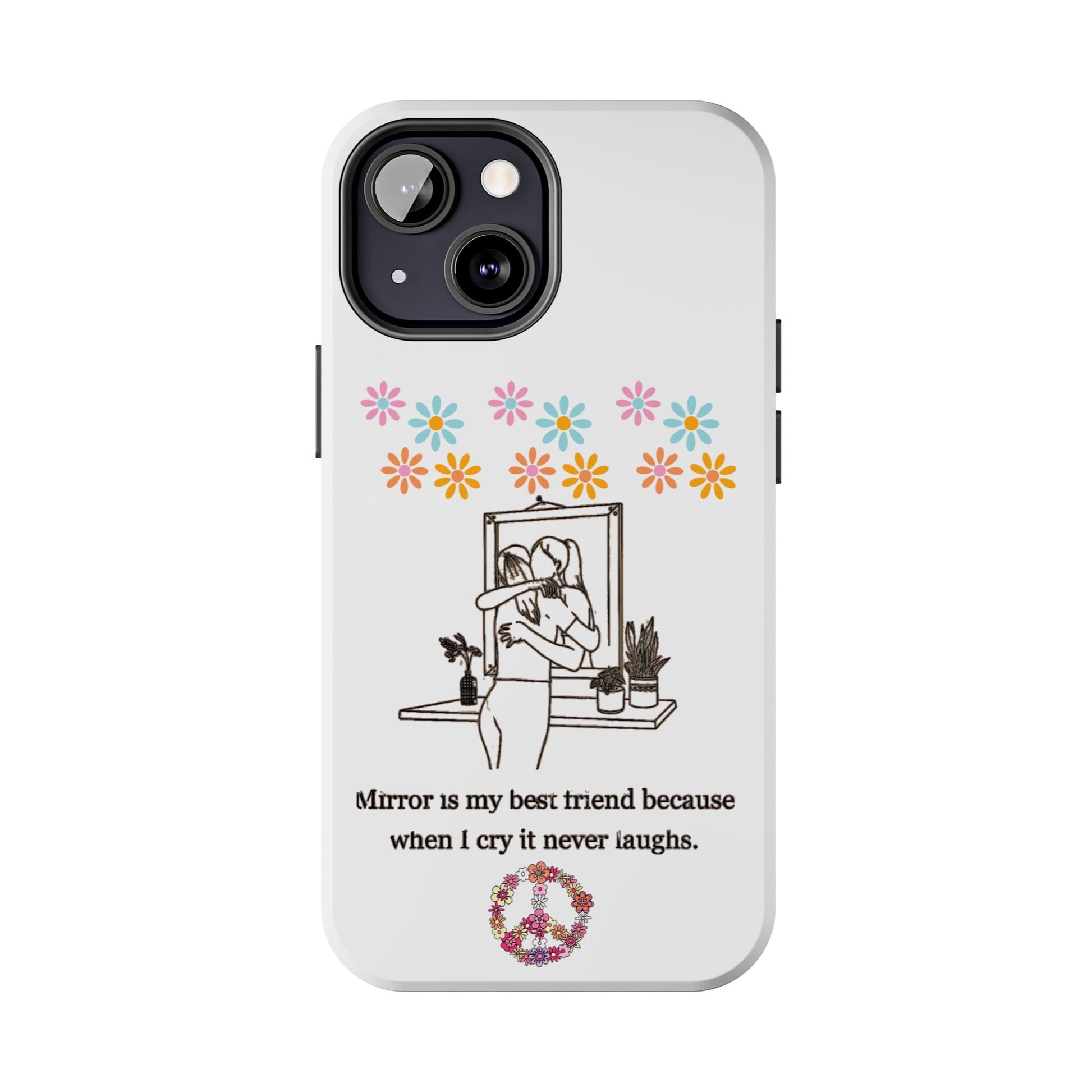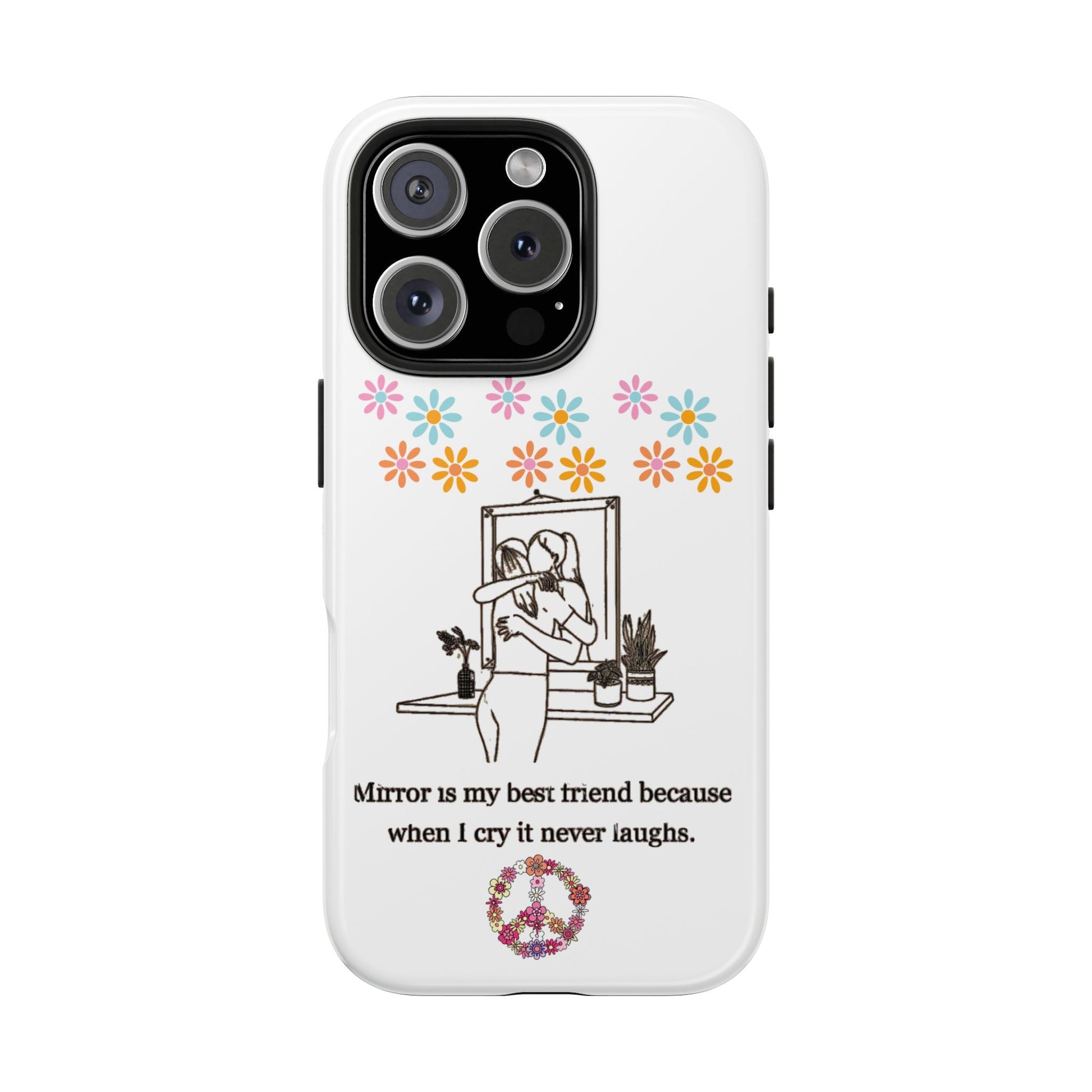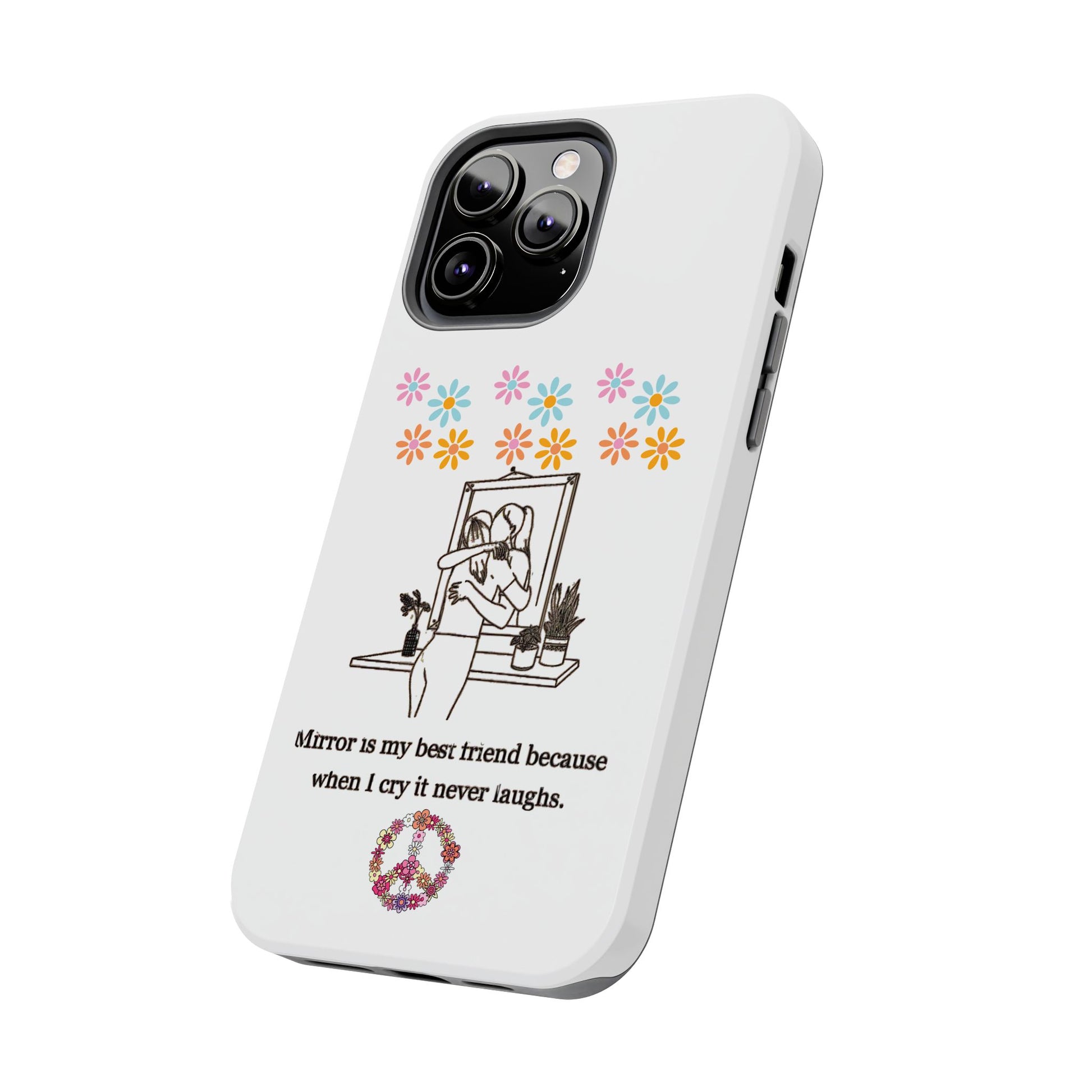 Carry your emotions with you with this “Mirror is My Best Friend” iPhone Case, featuring the touching quote: “When I cry, it never laughs.” This case offers both a meaningful message and sturdy protection, perfect for those who appreciate introspective designs. Ideal for personal use or as a thoughtful gift, this case provides a mix of style, emotion, and reliable defense for your phone.