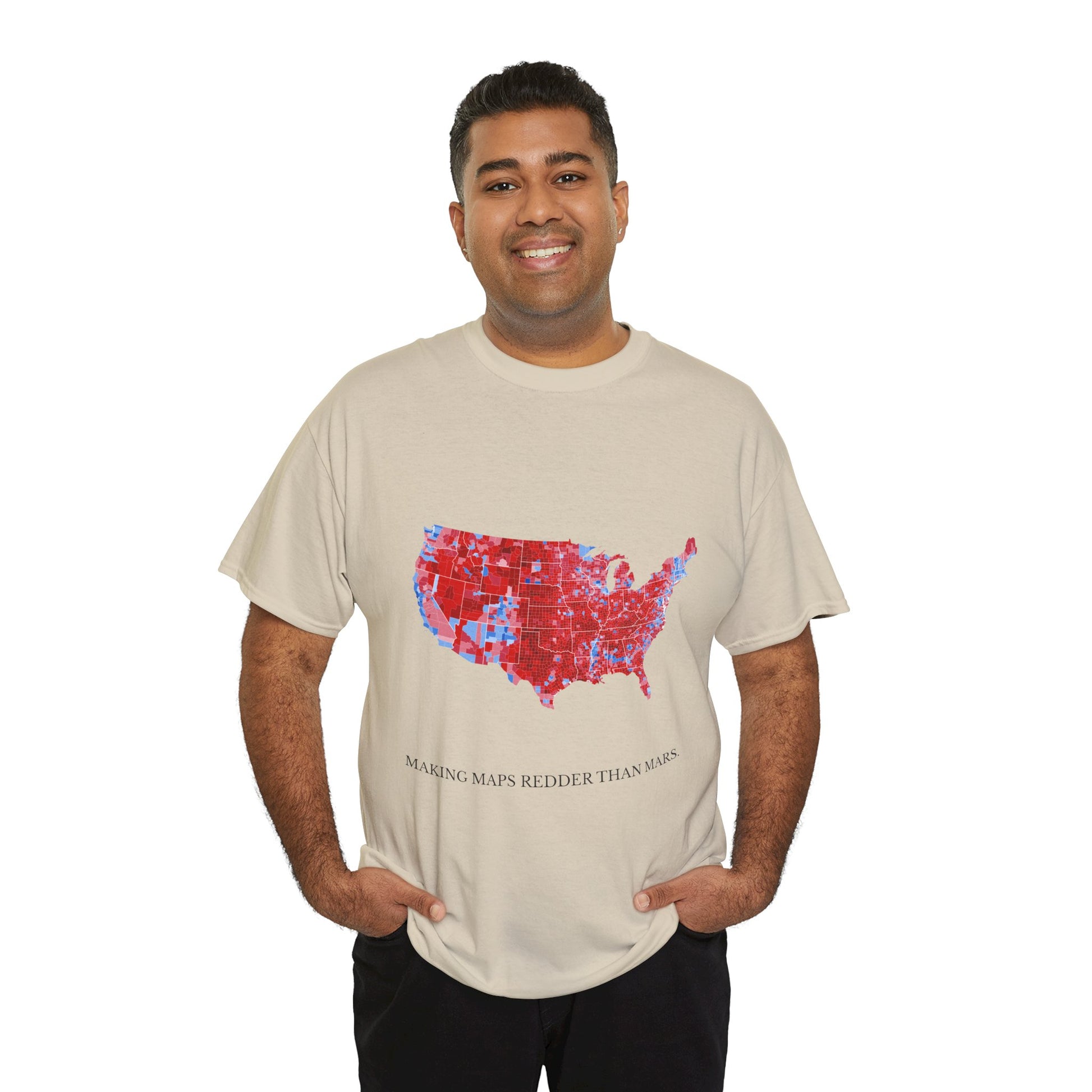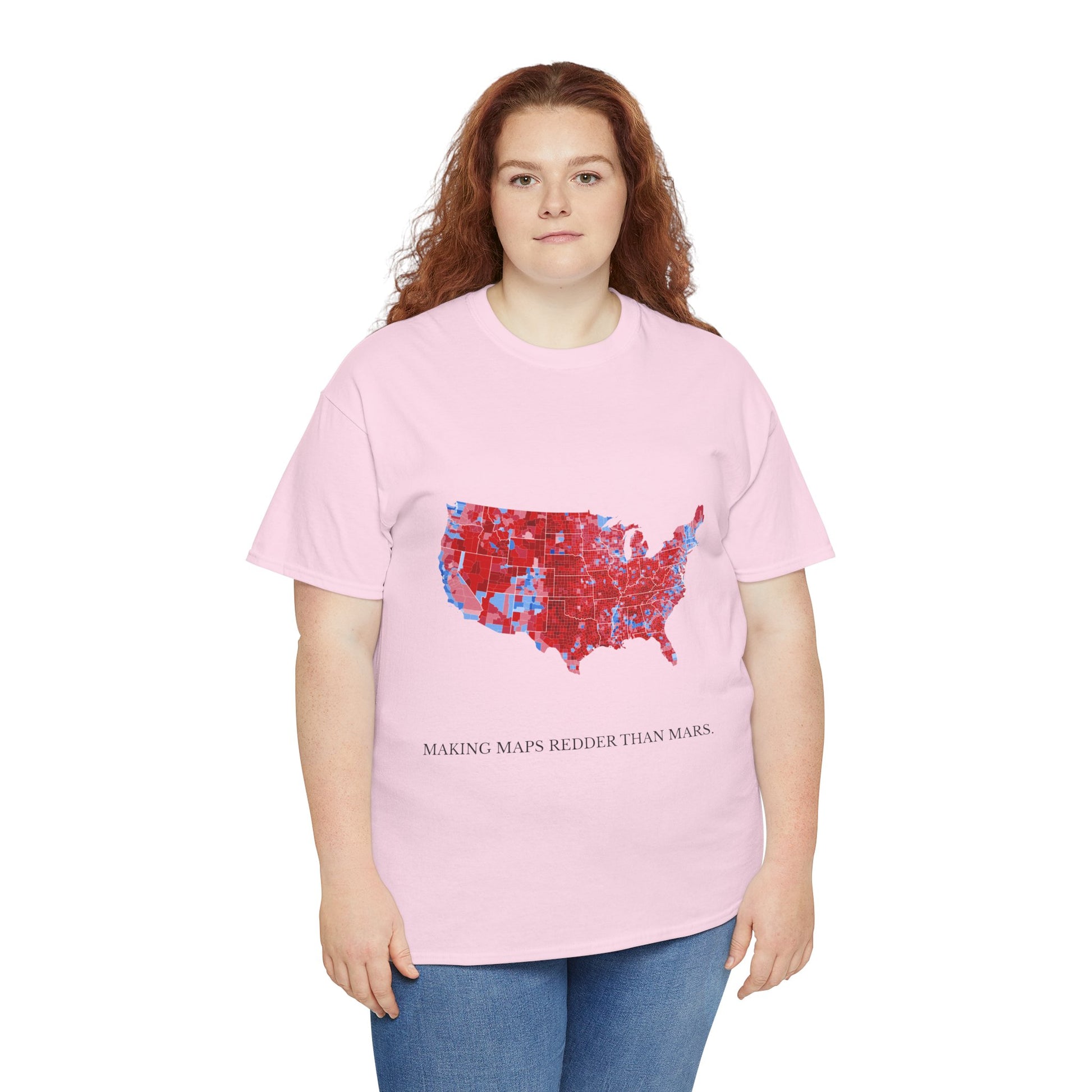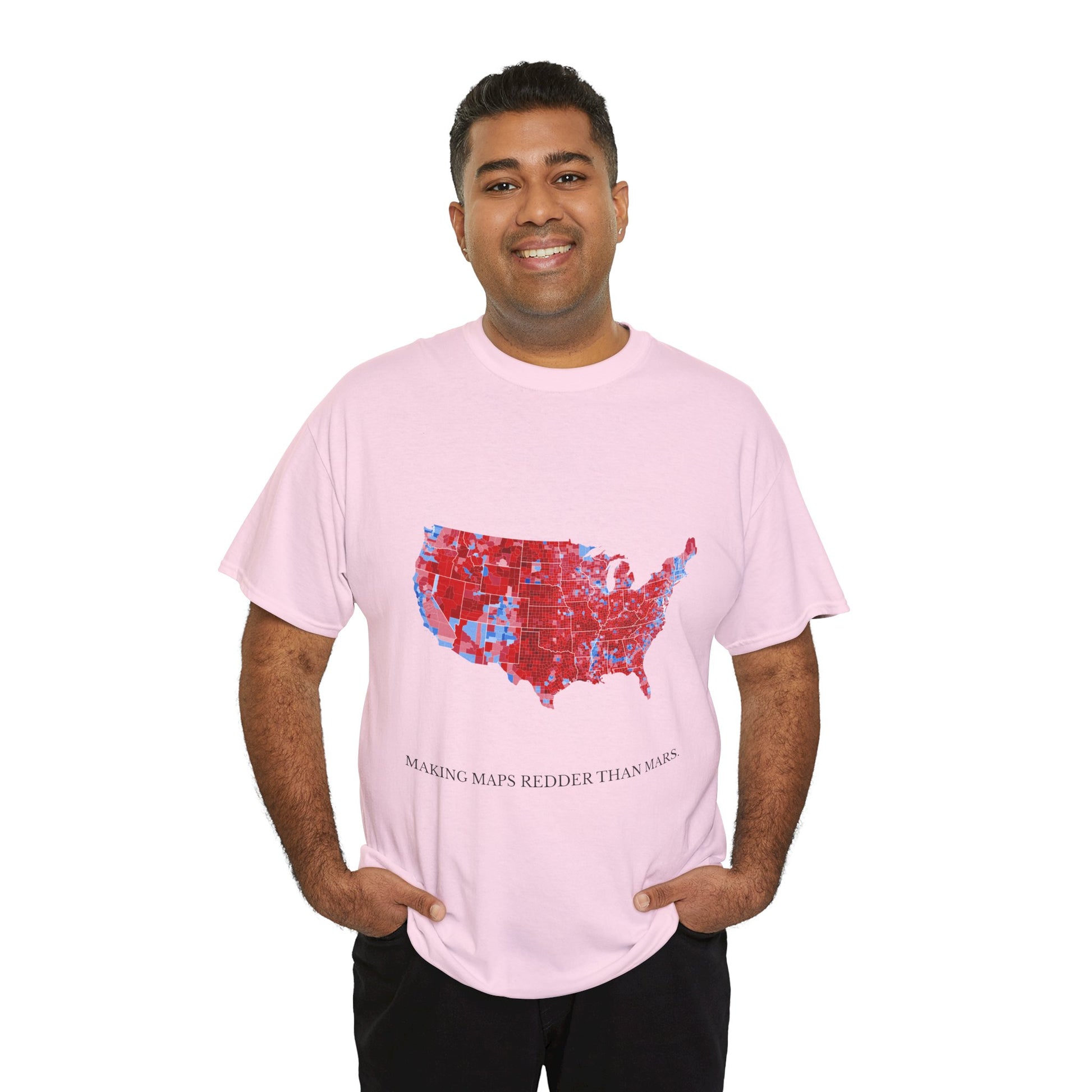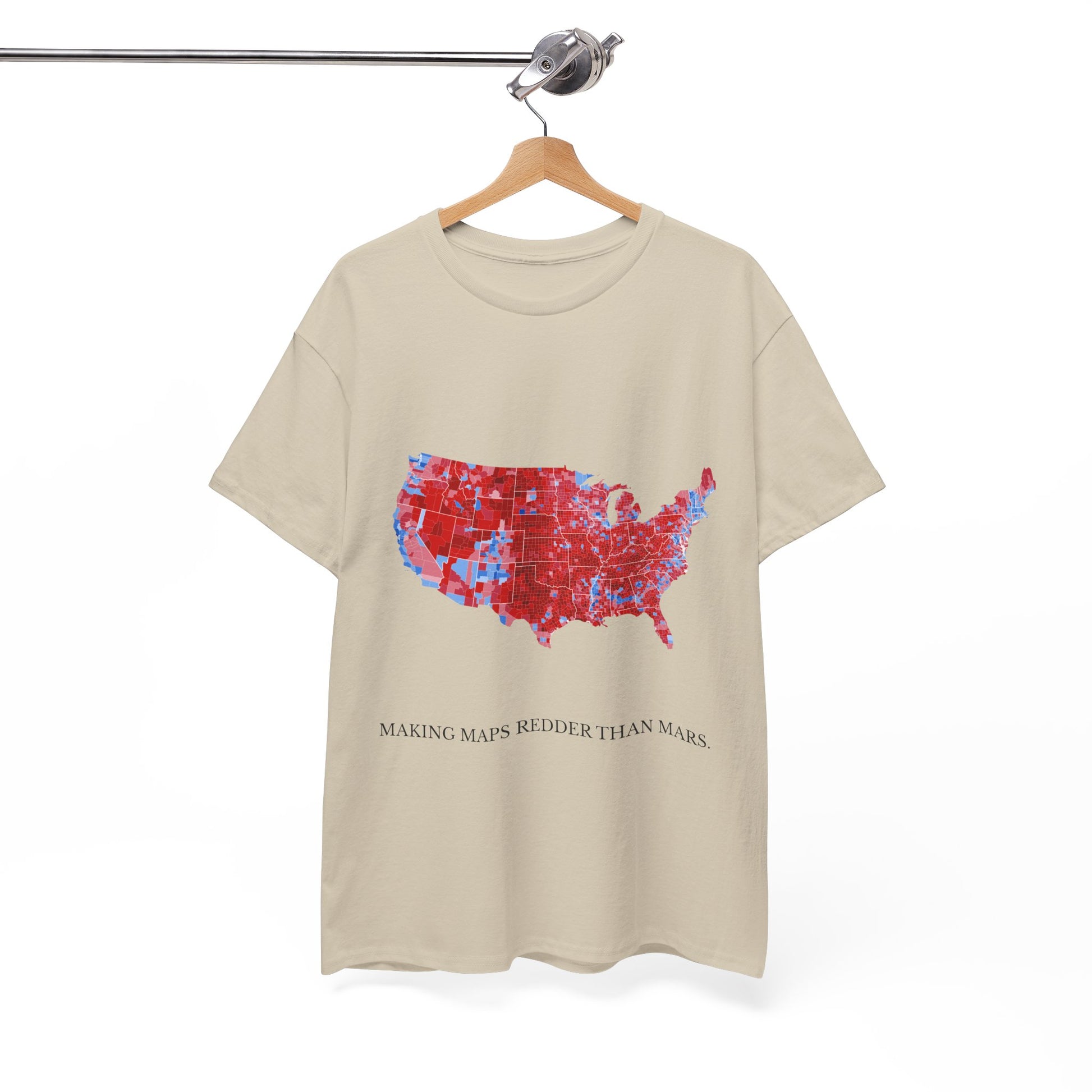Show your patriotic spirit with our "Making Maps Redder Than Mars" Unisex T-Shirt, featuring a bold map of the United States highlighting states that turned red in the latest election. This heavy cotton tee is a wardrobe essential, offering both comfort and style. Crafted from 100% ethically sourced US cotton, this shirt is not only durable but also sustainable, aligning with the US Cotton Trust Protocol.
