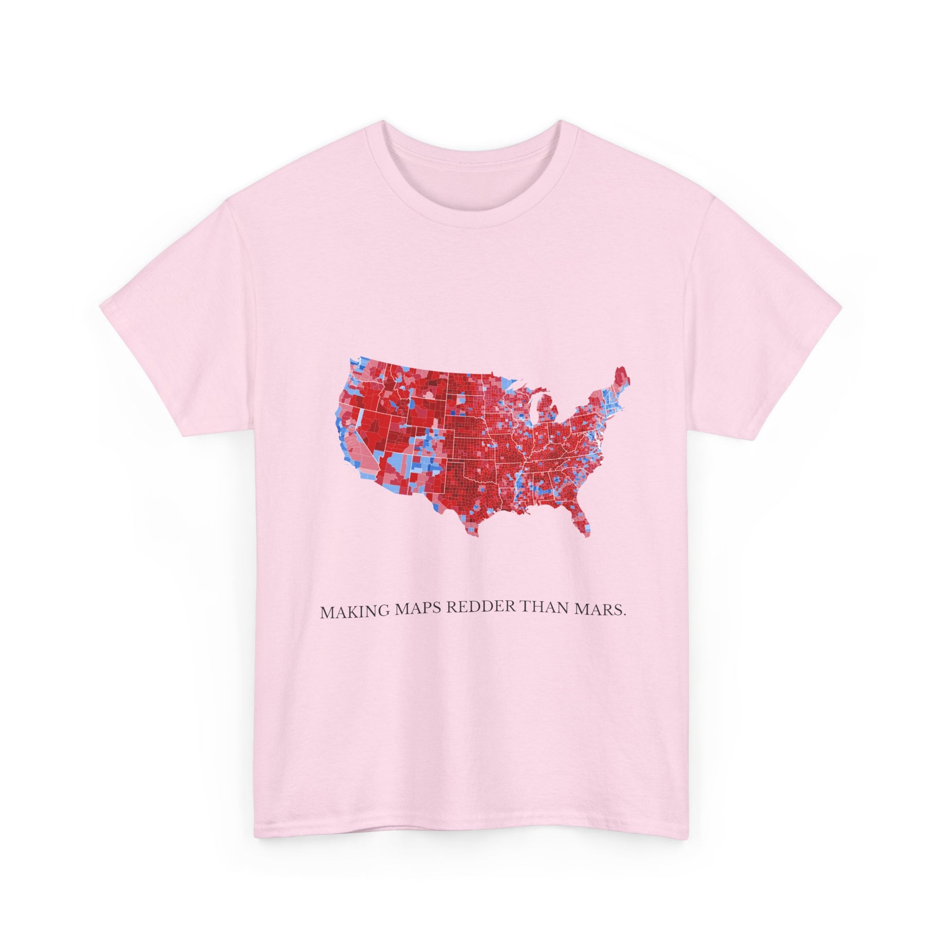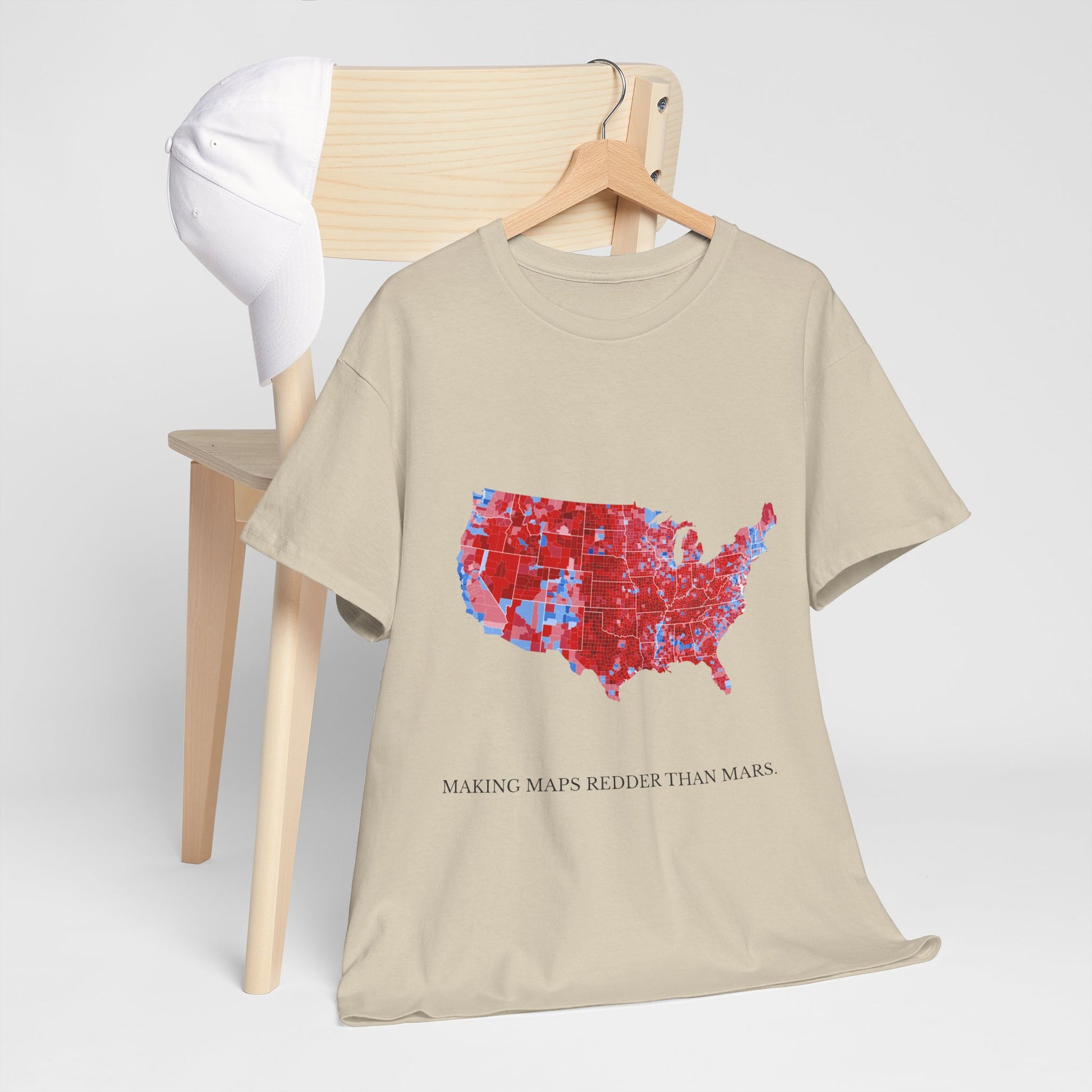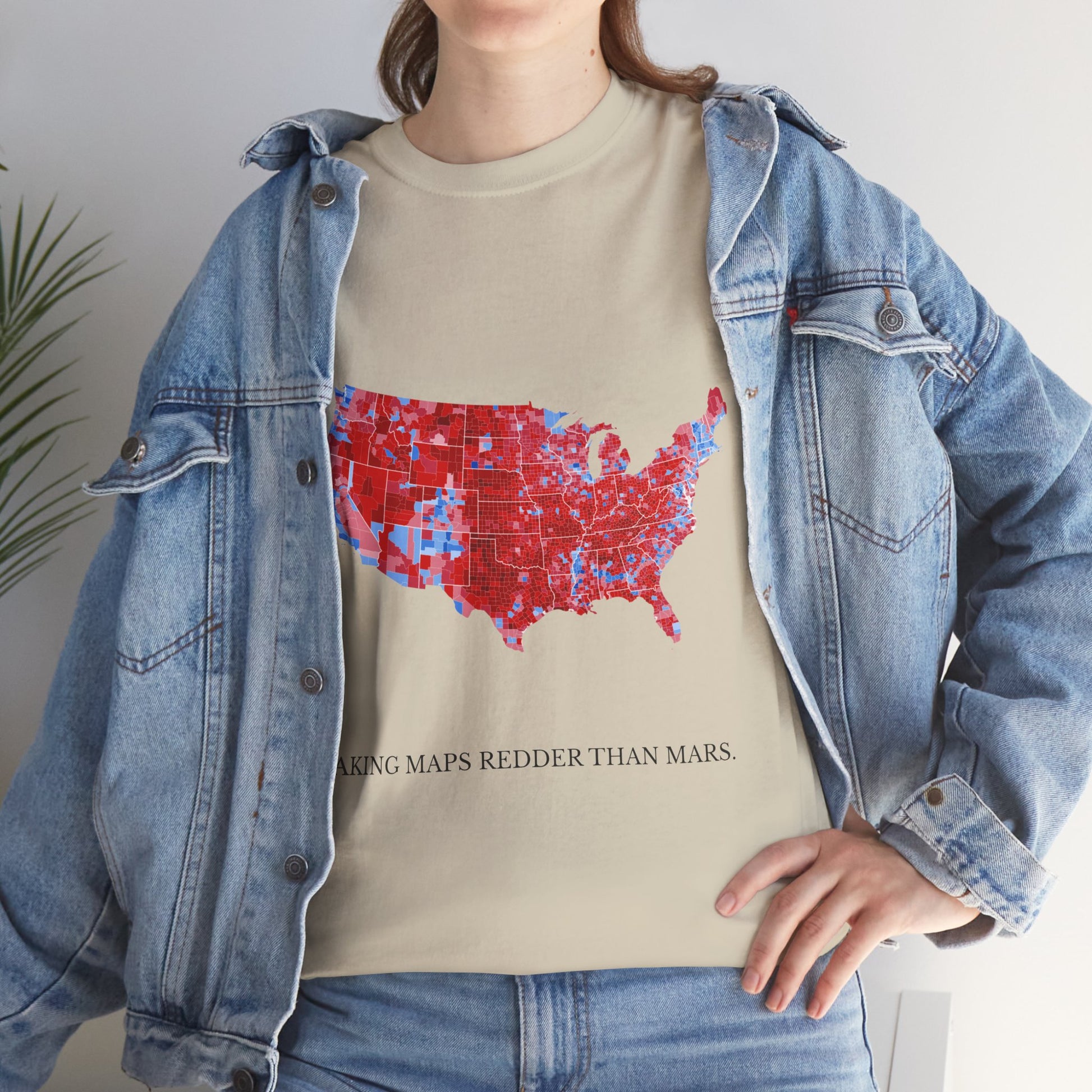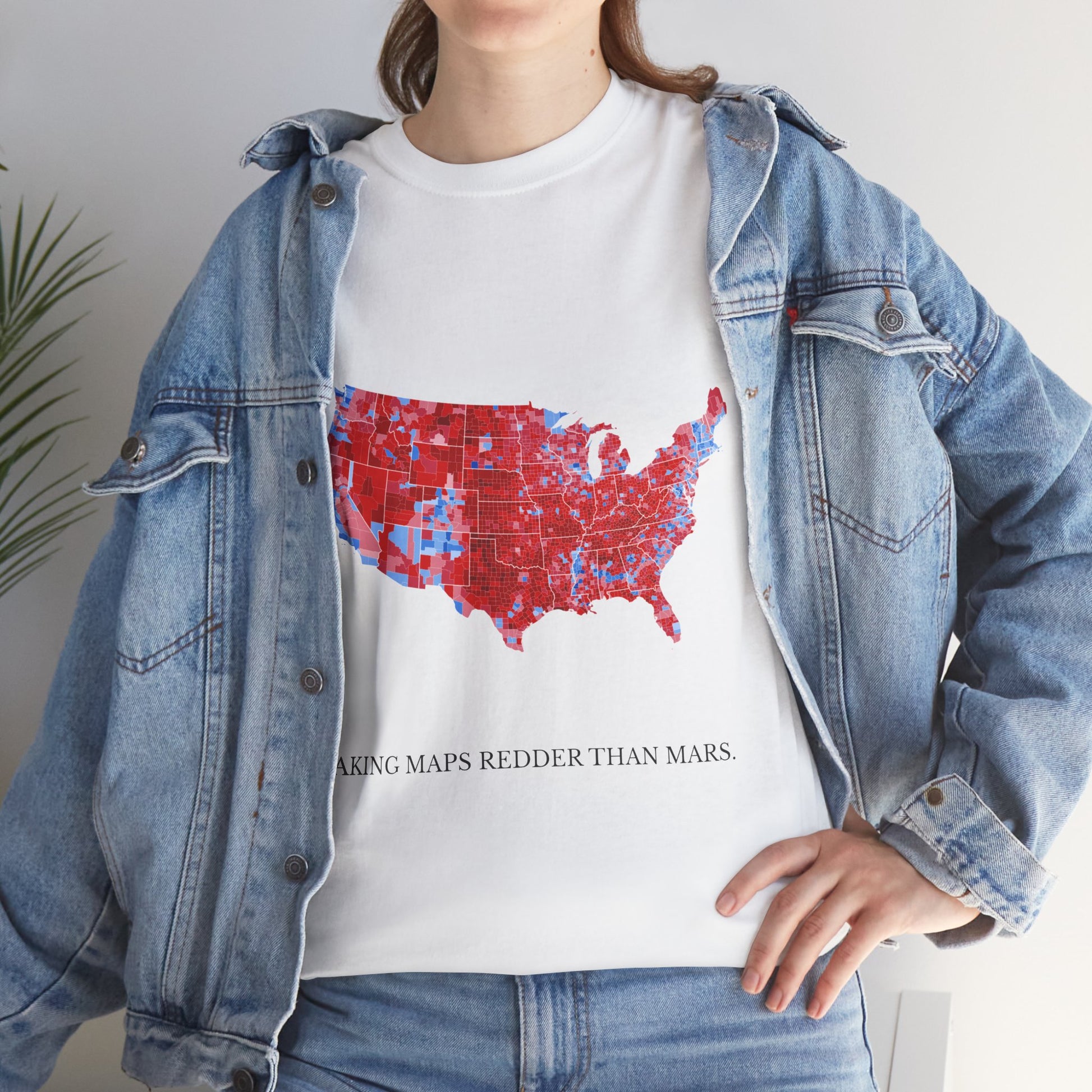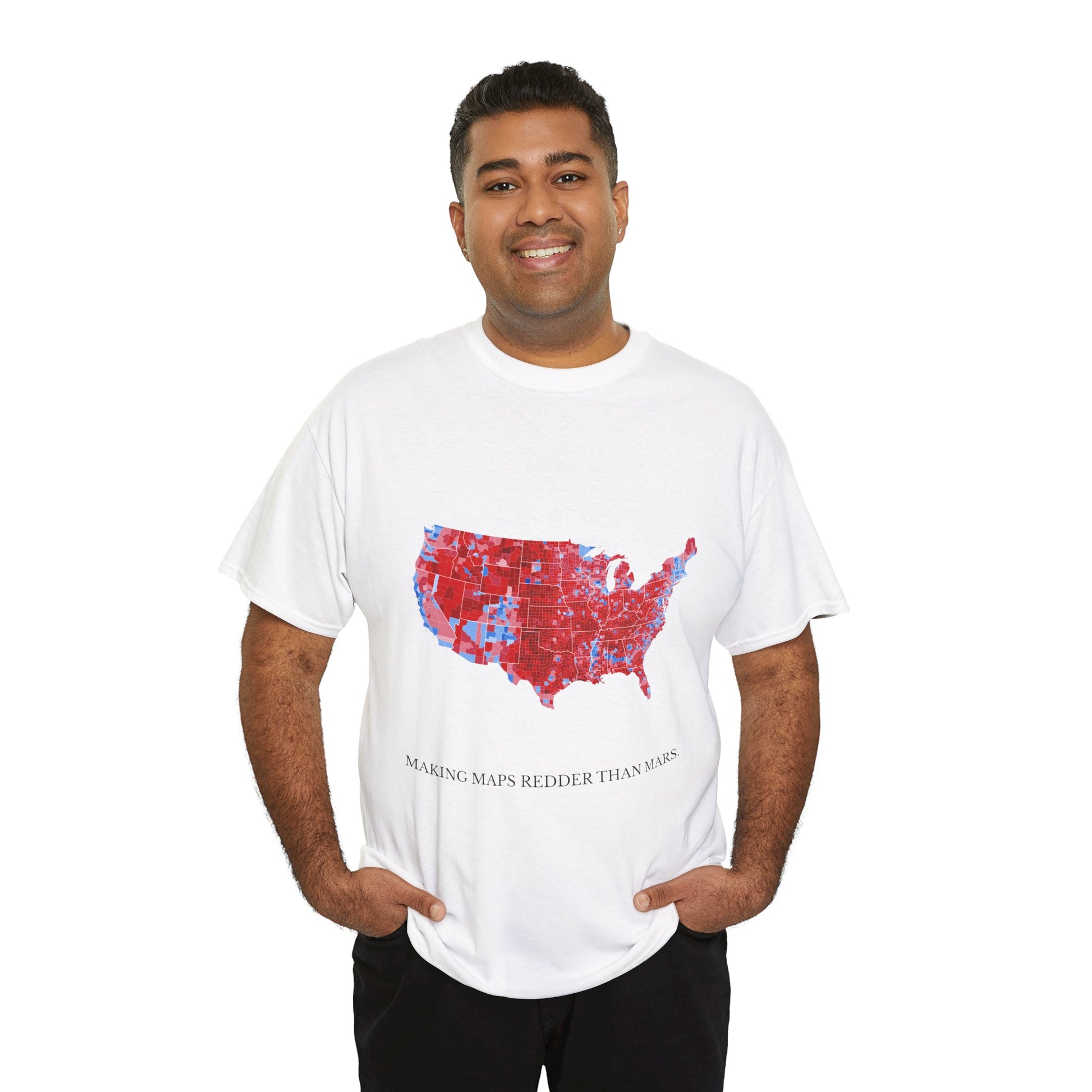 Show your patriotic spirit with our "Making Maps Redder Than Mars" Unisex T-Shirt, featuring a bold map of the United States highlighting states that turned red in the latest election. This heavy cotton tee is a wardrobe essential, offering both comfort and style. Crafted from 100% ethically sourced US cotton, this shirt is not only durable but also sustainable, aligning with the US Cotton Trust Protocol.