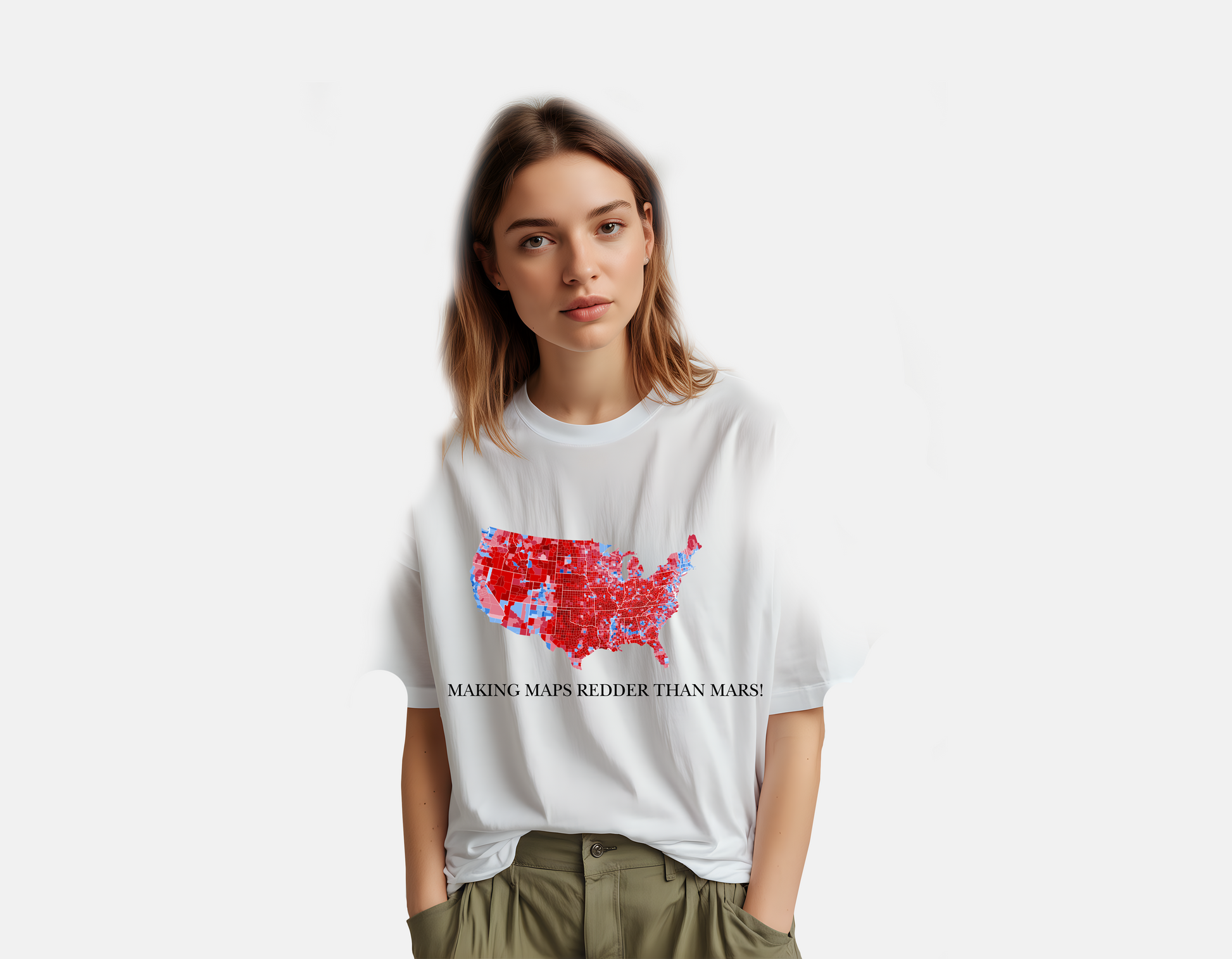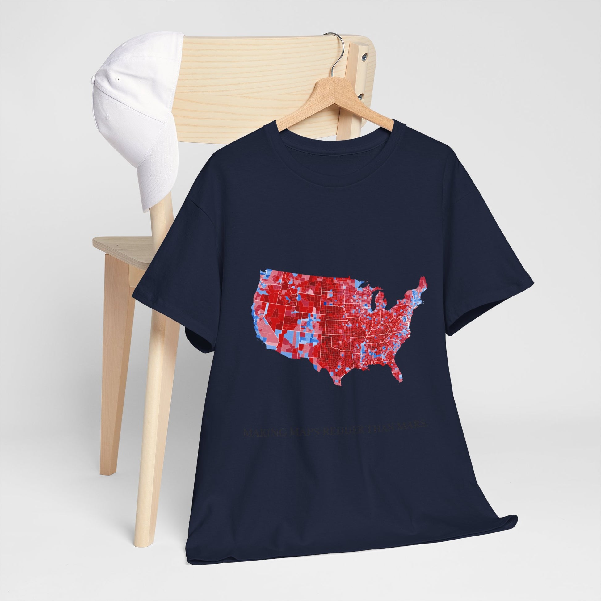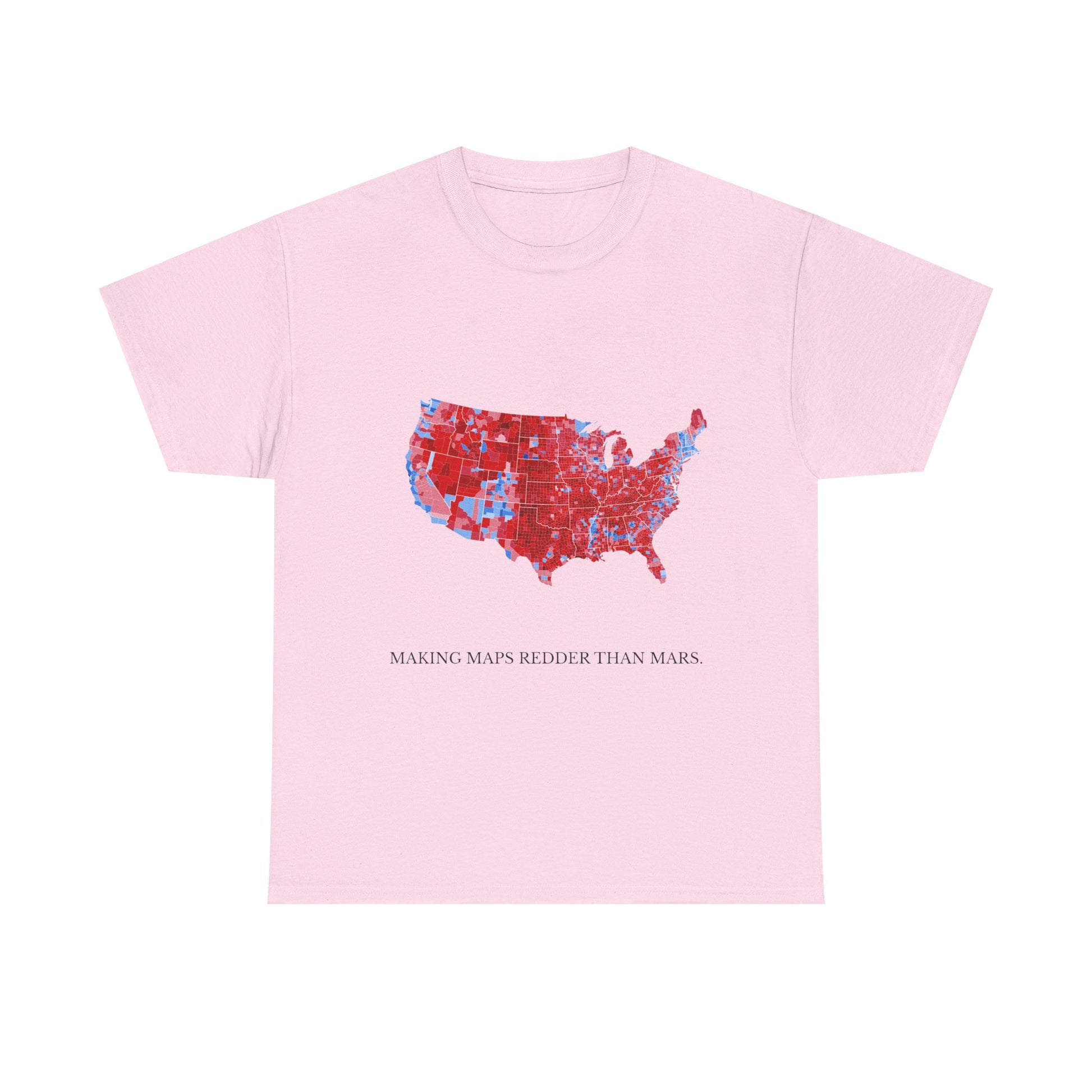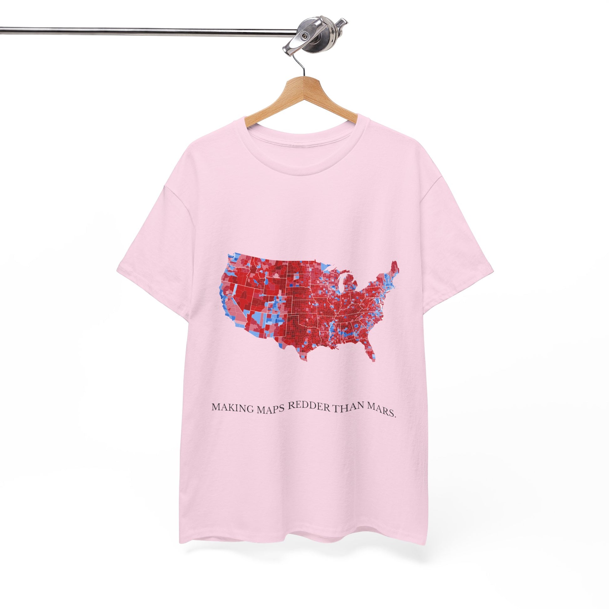 Show your patriotic spirit with our "Making Maps Redder Than Mars" Unisex T-Shirt, featuring a bold map of the United States highlighting states that turned red in the latest election. This heavy cotton tee is a wardrobe essential, offering both comfort and style. Crafted from 100% ethically sourced US cotton, this shirt is not only durable but also sustainable, aligning with the US Cotton Trust Protocol.